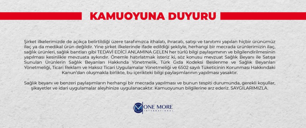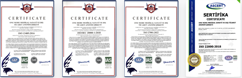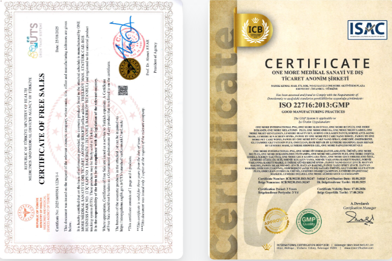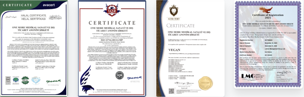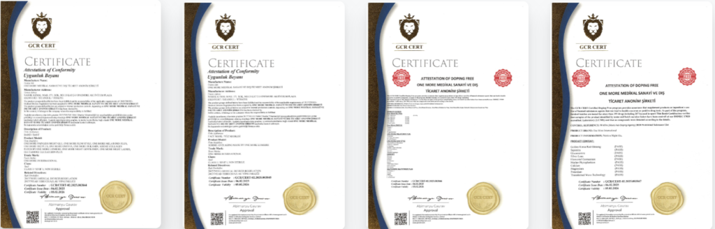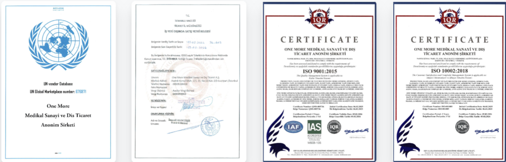 “One More International olarak ürünlerimiz için gerekli tüm yetki belgeleri ve sertifikalara sahibiz. ”